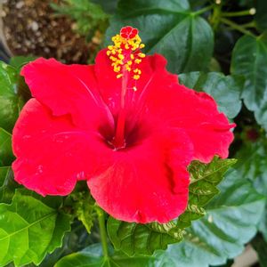 こんにちは👋😃 皆様暑中見舞い申し上げます。 大阪すでに 32℃越えにそなってます。 ハイビスカスの赤い花が 咲きました。 花径13cm きれいな赤いハイビスカスです。