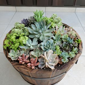 こんにちは☀ 多肉の寄せ植え🌵 今回は主人の何気ない言葉で 「大きい木の鉢あるやん。あんなんに入れたらどうなん。」 おっと。良いけど鉢がない💦 コーナンに買いに行きました。 いつもより小さめの木のプランター。 セダムと共にお持ち帰りです😆 ブルーオリオンをど真ん中に、 先日買った多肉さんと、家にあった寄せ植え崩して詰め込みました😊 セダム買っておいて良かったです。 結構な数使っちゃいました😅 でも可愛くなったので🥰