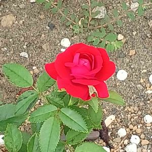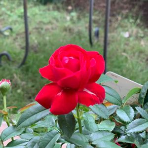 雨上がりの朝の薔薇🌹 すっきりとした姿のレッドキャプテンが二番花の満開を迎えています。 頭でっかちは同じでも、茎が強く育って、何とか顔が見られます❣️ 長持ちしてほしいなー。