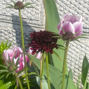 •*¨*•.¸¸私たち 大人チックでしょ🖤💜•*¨*•.¸¸(🖤❤️濃赤スカビオサより) チューリップとともにシックな空間になっていてなんだかいい感じです❣️ 寂しい花壇で、冬中咲いていたスカビオサ😳『あなたは強い💪🏻』 🏷「春色チュ!チューリップ♡」に参加させていただきます