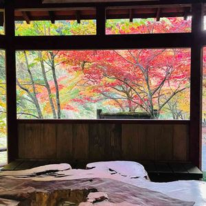 山門の手前の休憩所のような小屋の中から🥰✨✨ 大きな木の切り株の机も眺めも素敵でした🍁