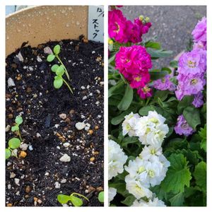 こんばんは😃🌃 先月種蒔きしたストック 八重咲きか、一重咲きかわからないまま鉢あげしました。 右八重咲きストック3色 苗から育てています。 春に、こんな風に咲いてくれれば嬉しいです。