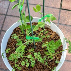 こんにちは👋😃 種蒔き苗で、寄せ植えました。 混色スイートピー ニゲラと、オルレア 7号深鉢に、3苗。 まだまだ、小さな苗 うまく育つかな。 スイートピーは、支え棒立てました。
