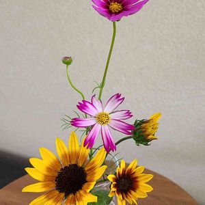 こんにちは👋😃 コスモスと サンビリーバブル ブラウンアイガールのコラボ。 このコスモスの、花茎は、まっすぐですが、あとのコスモスは、茎が、曲がっています。 少し早めに、切り花にしたひまわり🌻と コップに、生けました。