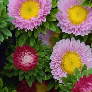 こんばんは😃🌃 今日は、久しぶりに、雨が、少し降りました。 種蒔きからの切り花アスター。 白い花だと思っていた花は、薄紫みたいです。 8号鉢に、5.6株です。 草丈、50cmくらい。