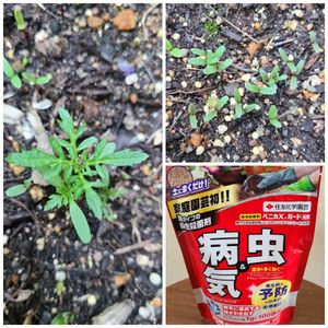 こんばんは😃🌃 マリーゴールドのこぼれ種の発芽です。 プランターを、土壌改良したいとこですが、大きな株は、そっと移植させます。 右下は、新たなアイテム 住友化学園芸の ベニカXガード粒剤。 土の中に、混ぜ込んで、使うものです。 植えたあとにも、パラパラ使えるようです。