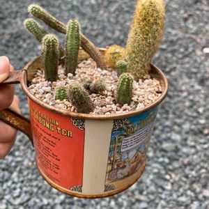 おばあちゃんの二件横の人がくれました😚でも、トゲが痛いのと、何となくサボテン🌵には興味があまりなかったのですが、きっとみんな、多肉植物=サボテン というイメージをなぜか持たれているのでご好意でくださいました♡笑 でも、根っこは一つもどこにも生えていない。黄色いのにいたっては土の上に置いてある感じです。サボテンの知識がなさすぎて😭なにこれーどこ植えるのー?ニョロニョロしたのは3分の1くらい埋めました。 このアメリカンな缶は、そう10年以上昔、親戚や家族みんなでアメリカに行った際の缶を母がとってあった、リアルアメリカン缶です。梅雨の間、雨ざらしていたら錆びて一瞬でアンティーク缶に。でも、アンティーク風じゃないから、置いてあった台には錆の跡がついて、超げんなり😱😱 この缶はアパートには持ち帰れません! 錆汚れはとれないもーん。 アンティーク風リメ缶はいいけど、リアルサビ缶はいかん‼️