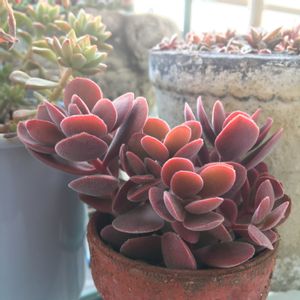 100均でお迎えしたワテルメイエリー。 4本あったのをチョンパして8本に(^m^ ) 小さな素焼き鉢にギューギューにぶっ挿して夏越し。 毎日直射日光浴びてもこの子は強い‼️ やっぱりクラッスラは大好きだー‼️ うっすらエッジが色付いてきたかな? 紅葉が楽しみです🍁