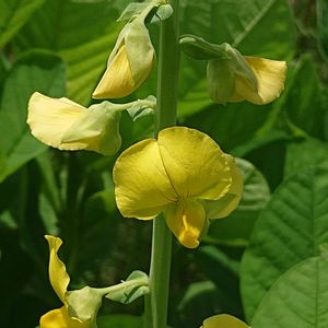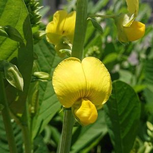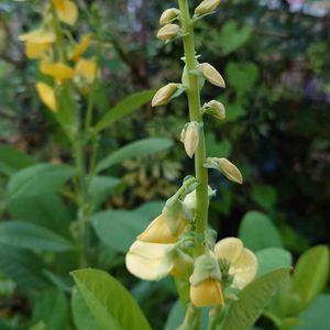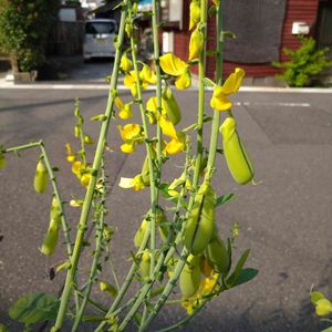 コガネタヌキマメ(クロタラリア) 散歩途中の農道脇の花壇で、見かけました。