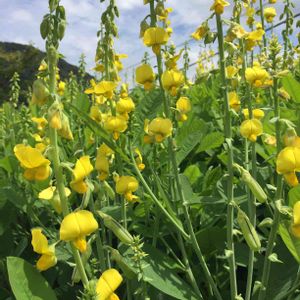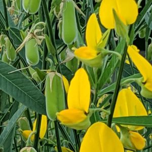 おはようございます。 海辺の薬草ガーデンに咲いていた黄色の花。 グーグルレンズによると、サンヘンプ? タヌキマメってことでした。隣にまるまる太った豆のさやがありました。