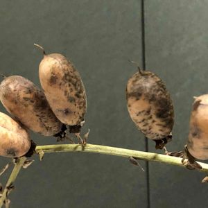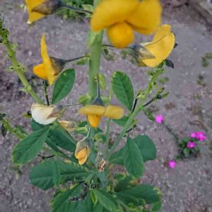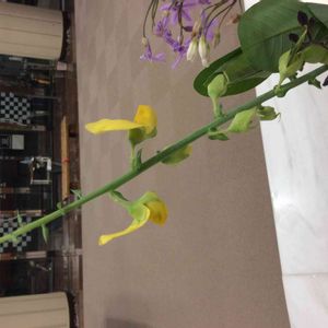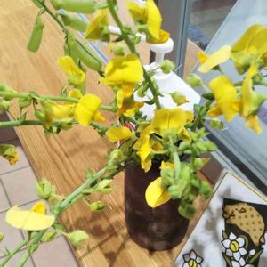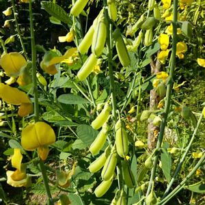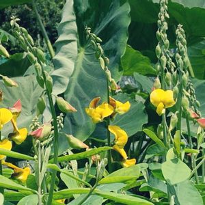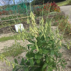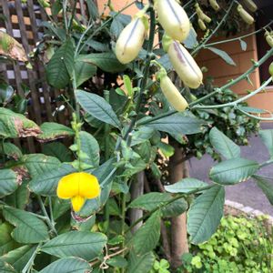以前黄色の花のみで名前教えてと頼んだのですが、分からず、今は豆?が出来てました。名前なんでしょう〜〜⁉️