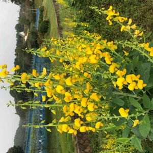 コガネタヌキマメ 可愛いい黄色のマメ科のお花! 面白い形のさやの中で種子がばらばらになりドライになった枝を振るとガラガラ、シャラシャラと 賑やかな音がします! さやは無毛です。 学名のクロタラリアはギリシャ語のオモチャのガラガラが語源だそうです!