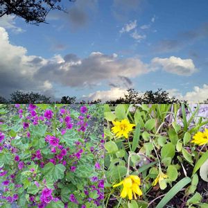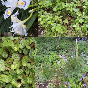 府中散歩(約1ヶ月前)② 緑道にて 中央は矢車菊や芝桜など色々 ↖️↘️植物用の溜池なのか、蓮の葉が! ↗️今年も白いシランは見れず ↙️かろうじて今日のお花 ツキミソウ(正確にはヒルザキツキミソウ)