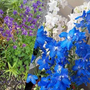 今日のお花 デルフィニウム 白→ミルキーミント 青→ミントブルー ミントブルーはチアブルーと同じに見えるけれど、違うのでしょうか? チアブルーは、お亡くなりになってしまいました。 右は自宅で、左は近所の花スポットです。