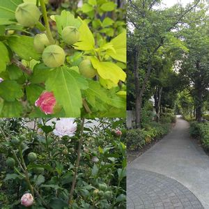 川崎市内 6月下旬 ㊧どちらもムクゲかな? ㊨いいかんじの癒しの道を見つけて嬉しくてパシャリ 🏷️金曜日の蕾たち