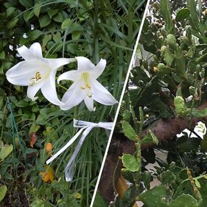 団地の子たち なんとかユリとウチワサボテン 思いやりで縛ってまとめられておりました。 我が家のセロームも暫くの間こうしていました。 広がりすぎていたので。 右は、ん? ウチワサボテンか? 柱サボテン?