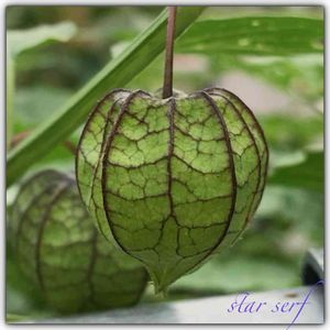 「ヒロハフウリンホオズキ」 熱帯アメリカ原産の帰化植物。名前は,ホオズキに似て,葉が広く風鈴のように実が下がることに由来して,ヒロハフウリンホオズキ(広葉風鈴酸漿)ちなみにホオズキの名の由来については,子どもたちがこの実の内部の種を取り除き,皮だけにして口に含み鳴らして遊び,その頬の形から「頬突き」となったと言う説と、ホオと言うカメムシの一種がよく付くからという説の2つがよく聞かれますが、どちらが本当か?解りません~想像して見て下さい。😓🌱
