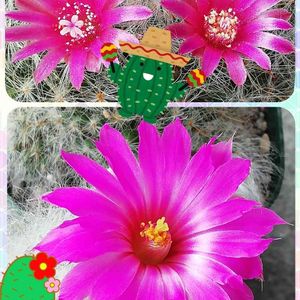 🌵サボテンの花🌵 ⬆️麗晃殿 ⬇️薫晃殿 白いふわふわした綿毛に覆われたサボテンで艶々で鮮やかなピンクの可愛いお花が咲いたよ(∗ˊᵕ`∗)🌵🌸