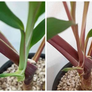 「通称赤ドラ」挿し木 ネット検索した所"ドラセナ カプチーノ"かなぁって思ってます。 外に出して1週間ぐらい経った所、緑だった新芽は赤くなりました。左(Before)→右 (After)。こんなにすぐ変わるんだぁ…。まだ葉色は緑だけど、色付いてくると期待してます。
