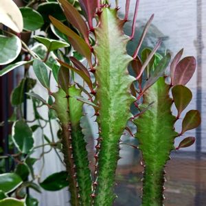 ユーフォルビア・トリゴナ赤斑 棘座に葉っぱがズラリとついていた赤トリゴナは春に葉っぱを落としながら全身真っ赤に紅葉していた クチャクチャになった葉っぱが全部綺麗に落ちたら撮ろうと思っていたけど 落葉し終わったら緑色になっちゃったよ(-ε- )💔 そんで また葉っぱ出てきた🌱 でもこのシルエットは好きだな