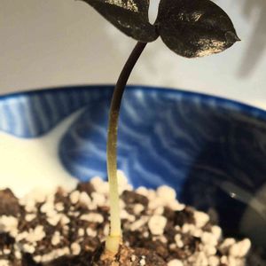 ザミオクルカス ザミフォーリア レイヴンの新芽です。通常のドリル状の脇芽と違って、親の葉と違う形状の双葉だったので掘り返したところ、新じゃがのようなリゾームが出てきてびっくり。普通に親の子株だったという安堵と何か知らない植物では無かった残念感、半々です😂