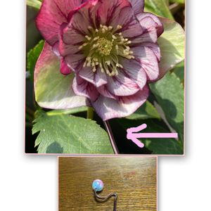クリスマスローズベインのダブルです。 下に向いて咲くクリローは撮りづらかったのですが、下の画像にあるワイヤーで作ったものを発明しプレゼントしてもらいました💞 これだと簡単にクリローさんのお顔を上げてスマホでパシャリ📱出来ます🎶 凄いアイデア💡 しかも可愛い😍 miiさん、ありがとうね〜🙋♀️