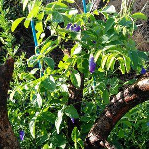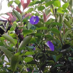 蝶豆の弦が隣の木に絡みつき赤芽に青い花が咲いてるみたい。