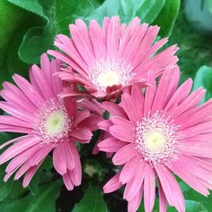 おはようございます😃 昨年夏にお迎えしていた☘️ガーベラ☘️さん 冬越ししてたくさんの蕾をつけ… 一斉に咲き始めました~(5個)☺️ 鉢が小さかったからでしょうか? 茎が伸びず💦切り花にはむきません😅 3色のうちの1色…優しいピンク色💕 可愛くて…うれしくて♪ 気持ちもウキウキになります🤭 花言葉が「希望✨」とわかり☝️ 改めて元気だそう🖐️って気になります✌️😁