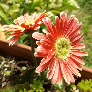 こんにちわ☺️ 今日もいいお天気🌞 うちの小さな庭も♪花盛り♪です😊 オレンジ色の☘️ガーベラ☘️が 2つ揃って咲きました🖐️ 元気づけられるカラーです😉