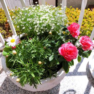 おはようございます。 少し前にプチフルールさんで見かけたアルメリアに一目惚れして、それに合わせて赤い花で寄せ植えしようと思いローダンセマム マーズを一緒に購入。ハクサン様からいただいたプリムラもこちらに移しました。 間にはこぼれ種から生えてきたカスミソウジプシーと、オレガノミルフィーユの挿し木を入れました。 赤い花が増えて、この一鉢だけで小さな庭が華やかになりました。