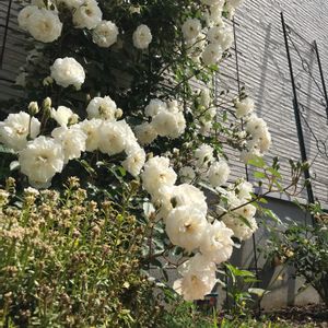 夏の間にずいぶん伸びて、高いとこまで咲いてくれてます🌹💕 繰り返し咲きで、ずっとポツポツ咲いてくれてますが、秋の気配に一気に花数が増えました😆🎵