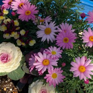 お正月の寄植えの上で干支の寅さんから卯さんへ、節分まで引継式 招福コポタンが仕切ります🎶 葉牡丹の紫が艶々です💜 🏷6日はカエルの日 参加させて下さいね🐸