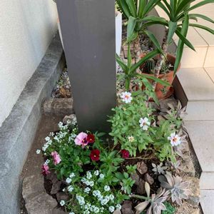 玄関にカランコエを移動した^_^ 秋だし綺麗に維持出来るといいけど、結構虫に葉を食べられるので穴が空き出したらまた鉢植え🪴で過保護に育てます。 ちょっとお試しです。 一番左のマムは一度パープル咲いたけど、秋復活できるかは謎。すごく元気に一年生きてきたので回復してほしい❤️🩹 左右にある木は幸福の木か青年の木か区別分からないー けど、バルコニーでまだ沢山住んでおります。笑 手入れ要らずですがグングン成長するので門柱左のは先週大きいのを抜いて、小さいのに植え替えました。 その後ぎっくり腰になりましたので、今も歩くのがやっとです。
