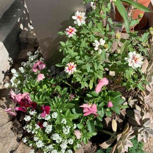 地植えに💕 上 🌸八重咲きジニア ザハラ ダブルラズベリーリップル 可愛いです❤️ 横の黄金葉はルブス 。。木いちごの仲間ですがこれは葉を楽しむカラーリーフです。 そのうち大きくなりすぎるかなぁ😅 下 🌸PWスーパーアリッサム 鉢植えから地植えに❣️ パープルプリンセスとフロスティナイトが勢いよく大きくなってきました😄 白のジニアのプロフュージョン 真ん中にうっすらピンクが入ってます💕