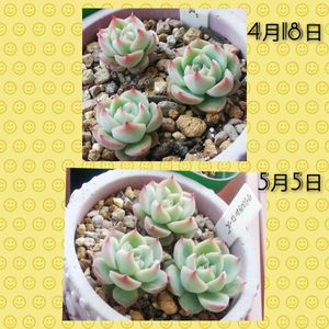 ←3月末頃 →5月上旬 真ん中のルブラ(赤いやつ)の上のベレン成長しすぎ(「`・ω・)「 梅雨前の多肉事大変ですけど、頑張りましょーーー