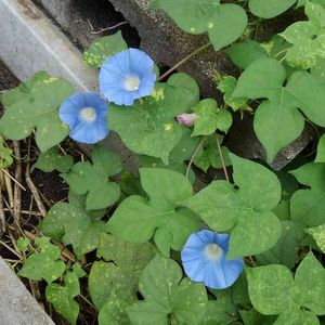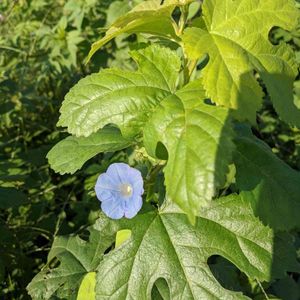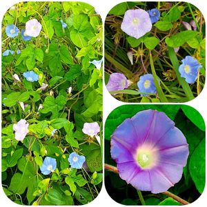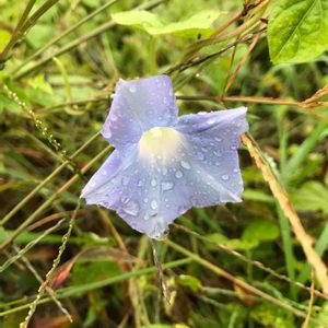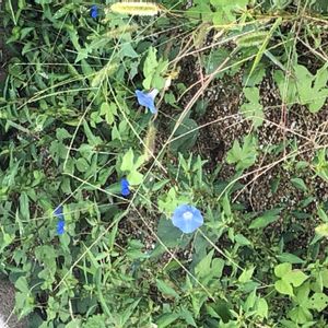 野原の朝顔『アメリカアサガオ』です。 青の花ですが水色〜青 藤色寄りの水色などのバリエーションがあります。 この花はボカシの入った水色で珍しいので撮りました。💚🤗 3〜4cmくらいの小花朝顔は園芸種にしたいくらいですがそこかしこに咲いてるので敢えて育てなくても〜って? (笑) 白いツブツブ花…名前がちっとも思い浮かびません…昔からよく知った草なのに😭チホウが怖い〜🤎