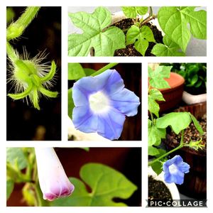 今日のベランダ🤳 まだ9時26分なのに、こんな色のこぼれ種アサガオ🤔 つぼみ、見ぃつけた😊 若い姿の、あるすとろ芽りあ😅 横から見ても上から見ても、アンバランスのバランス⁉️