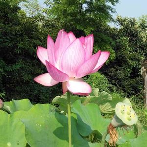 蓮の花 古代ハス 畑の横に鉢植えで育てているハス 葉っぱの下には蕾が控えています