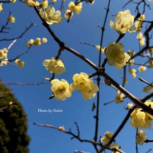 近所の神社のロウバイです。 青空バックがキレイです✨ 近づくといい香りがしました🥰