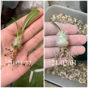 2019年9月にジャッカルさんにお譲り頂いたドルステニア ・フォエチダの実生株とアガベの…なんだっけ:(;゙゚'ω゚'): しっかりした鉢に植え替えしました! 私が実生したフォエチダも、親指の爪くらいになりました♪