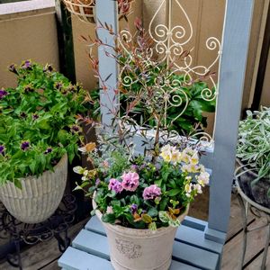 トレリス付き 椅子型花台🪑 倉庫に眠っていた木枠をワイヤークラフトで再利用してトレリスを作りました💞 そこで終わるはずだったのですが 以前ガーデニング教室で作った椅子型のプランターボックスに合わせて見たら何となくいい感じ!✨ 二つをアオリ止めで合体させ スノコを載せて全体を塗り直しました。 プランターとしても花台としても使える二刀流の出来上がり!🌿🌸🌿🌸🌿 断捨離を決意しているのに 再生利用でいつまでたっても身辺整理が進みません😅💦