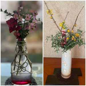 おはようこざいます☁️ 今週は大寒波がやってきそうです。 暖かくして乗り切りましょう‼️ 🍀ロウバイ ローズマリー 左リビング 空瓶にワイヤーアレンジ 右和室 蒲鉾板の花台
