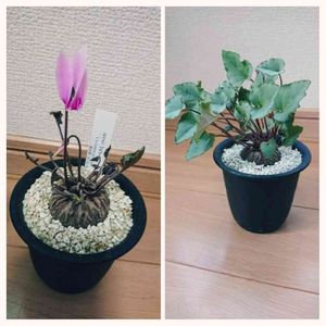 おはようございます❗ 本日のご紹介はシクラメングラエカム🎵原種のシクラメンみたいです(*^^*) ちなみに購入してから1ヶ月近く過ぎてしまい…左が購入時。右が本日。 の姿となっておりますf(^_^;