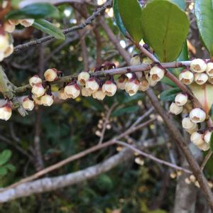 ヒサカキの花は春 ハマヒサカキは寒い時期に咲き花期が長いので 実が同時に見られるようです。ガスのような匂いがする為ガス漏れと騒がれることも!写真を撮りながらも匂っていました。(^◇^;) この後実も連続でアップします。2の1