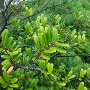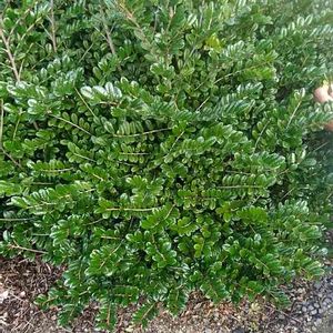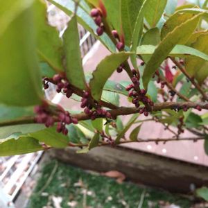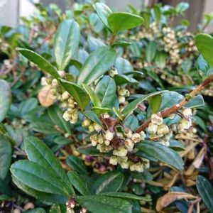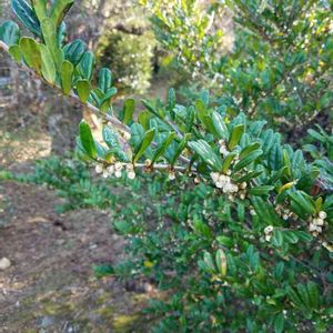 職場のキャンパスの駐車場の沸きに大きな林の様な植え込みスペースがあり、そこからひょろっと伸びる割とまっすぐな枝に、沢山丸い緑の実が付いている樹がありました。葉っぱは、小さくてツヤツヤしていて、イヌツゲの様ですが、枝がまっすぐで長いです、4枚の葉がセットで絵柄からのびて着いているように見えます。調べて見ましたが名前が分からず、皆様ぜひ御指南お願いします。もうすこし全体を撮っておくべきでした。