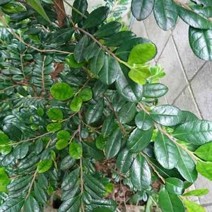 訪問先の駅前の植え込みのイヌツゲなのか?それにしては葉が大きい気がします。 ここの植え込みも近いときに刈り込みされたのでしょうか?ところどころ,綺麗な新緑が伸びています。葉っぱが大きい事、実が枝の中頃に付くなどの特徴を再度見に行ってハマヒサカキとしました。