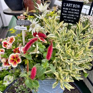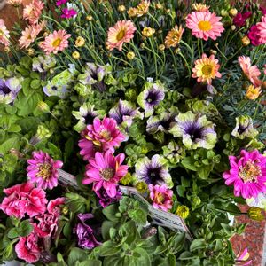 ふるさと納税の寄せ植えコース💐 (年4回届くうちの1回目) お花のチョイスに可愛いピック、近所のHCでは手に入らないお洒落な鉢! 5月上旬に届いたときのpic📸 ベランダの後ろがゴチャゴチャして 分かりにくい写りになってゴメンナサイ🙏