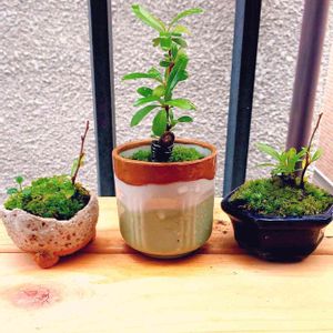 おはようございます! ピラカンサの挿し木から、ミニ盆栽が三つ出来ました。😊 真ん中の鉢はおちょこに穴を開けたものです。