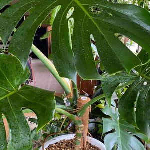 お出かけしてた時、 少し窓を開けてたら、凄く風が強かっらしく大きくな葉っぱのモンステラ・デリさんが根元から倒れた😱😱 とりあえず補助して支柱を立ててはいますが安定しないので 植え替えをしました💦💦 しかし重たい😅😅