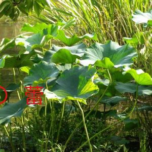散歩道で見つけた蓮の蕾 散歩道(京都丹波 南郷池)で、蓮の葉の中に、蓮華の小さな蕾を見ました。 ※ 赤〇の中に蕾が、、、